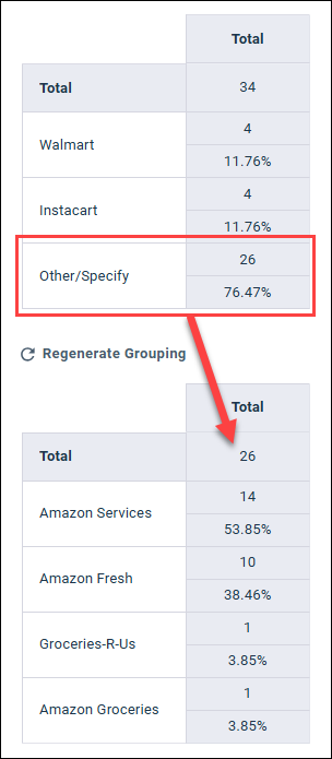 Automatically group similar responses to other/specify answers and NPS follow-up questions to understand the main topics and their frequency.