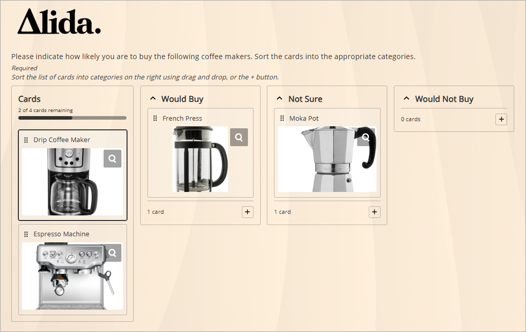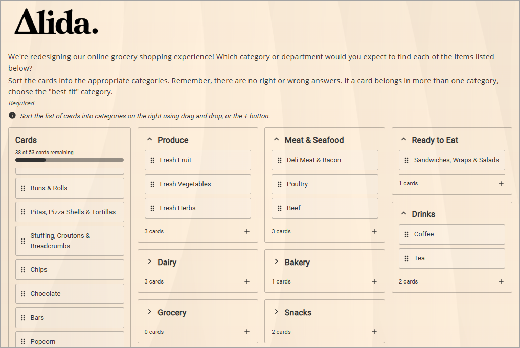 A closed Card Sort question asks participants to sort cards into pre-defined categories. The cards can display images, text, or both. Participants add cards by dragging and dropping them into the categories. Alternately, they can click the plus buttons on the categories to add a card. They can also collapse and expand categories while they sort. There is no option for participants to create and name their own categories.