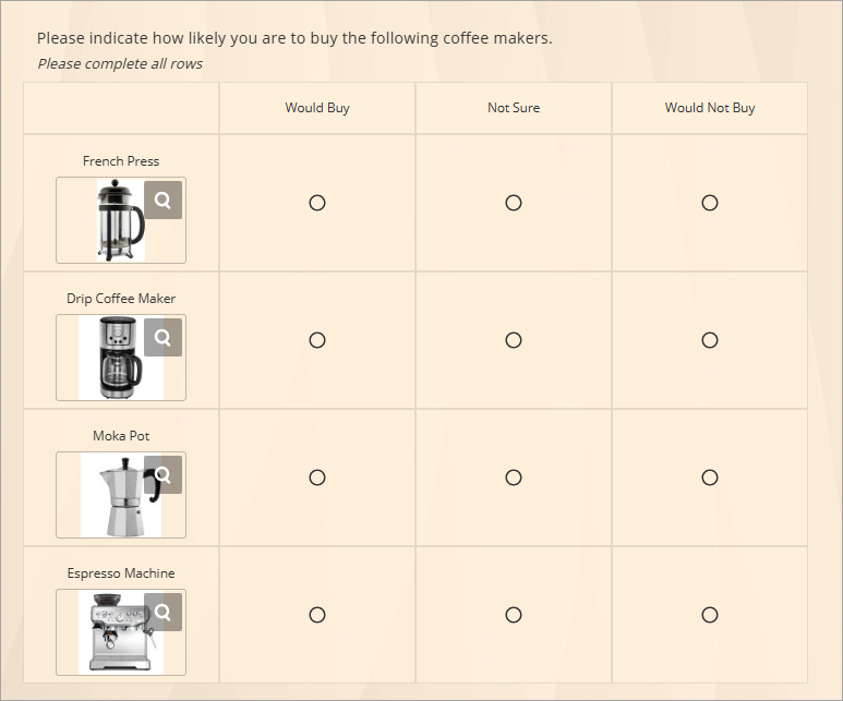 For example, here is a Single Choice Grid question that asks participants how likely they are to purchase different types of coffee makers: