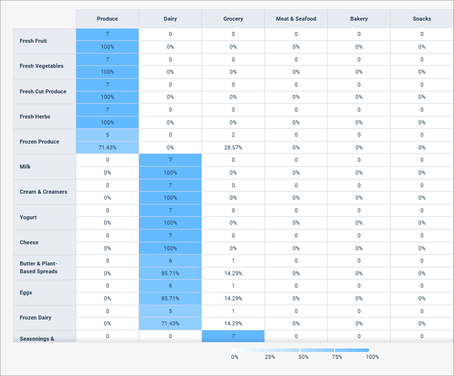 - The darker the shade of blue in the table cell, the more frequently that card was placed in the category. Look at the legend at the bottom of the table to interpret the blue color-coding.