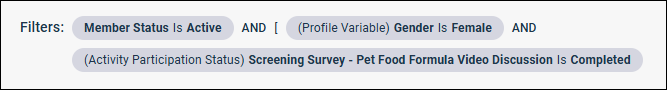 Alida AI is able to infer that it can use the Gender profile variable to identify Female members, and it also understands that "the pet food screening survey" matches "Screening Survey - Pet Food Formula Video Discussion" without requiring that you enter the exact name. Based on its interpretation of the prompt you entered, Alida AI displays the member filters it is using to select the members for your member group. You can review these filters to ensure that you are getting the expected results.