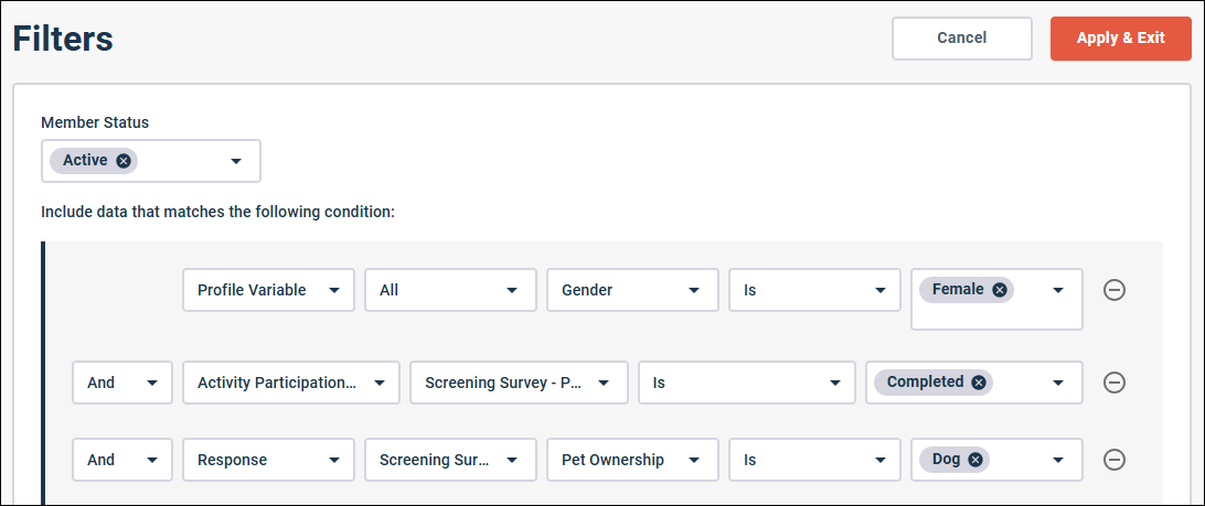 If you click Filters on the Members page you can edit the filters created by the AI Member Group Builder. For example, if you want to add an additional filter criteria for members who responded to a survey question indicating that they were dog owners, you can update the filter defined by Alida AI. Response filters are not currently supported by the AI Member Group Builder, so you cannot specify this type of response criteria as part of your AI prompt.