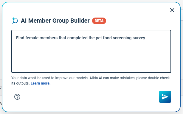 - The AI Member Group Builder cannot process the prompt if it encounters an unsupported type of member filter, or contains invalid logic (for example, "Completed the pet food screening survey tomorrow"). The AI Member Group Builder does not currently support Response member filter types, so you cannot use it to create filter criteria based on member responses to a specific survey questions. You can manually add Response criteria to the filter generated by the AI Member Group Builder.