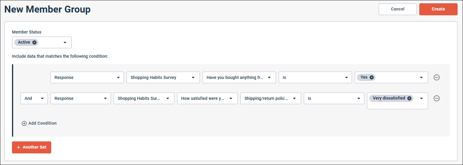 The following examples show several ways you can use these filter conditions. You can also use these types of filter conditions in combination. For example, your filter might include member status, activity participation status, and survey question responses to identify a very specific member group.
