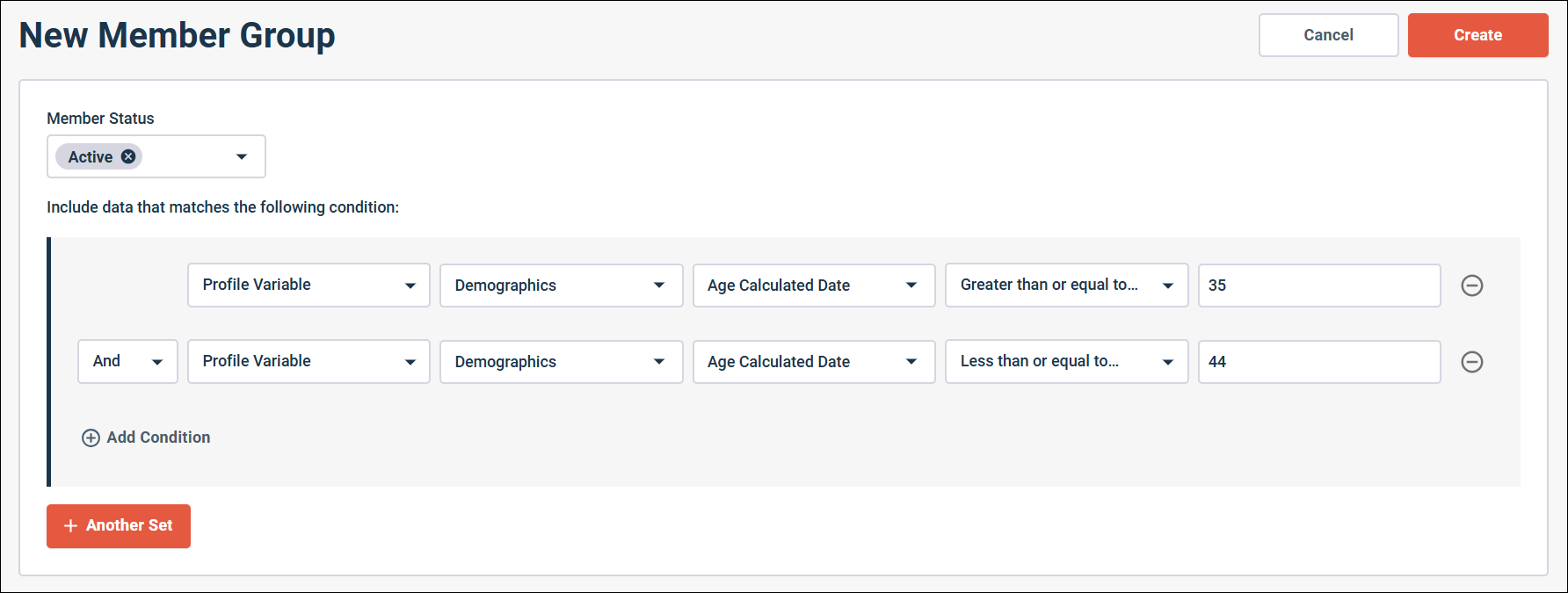 You select a member group dynamically based on the current age of each member when the member group filter is applied. ![]() To do so, you create a filter with the Calculated Age profile variable, which is a Calculated Date type profile variable that references a Birthdate profile variable that contains each member's birthdate. All members that are currently between the ages of 35 and 44 are selected whenever the member filter is applied. |