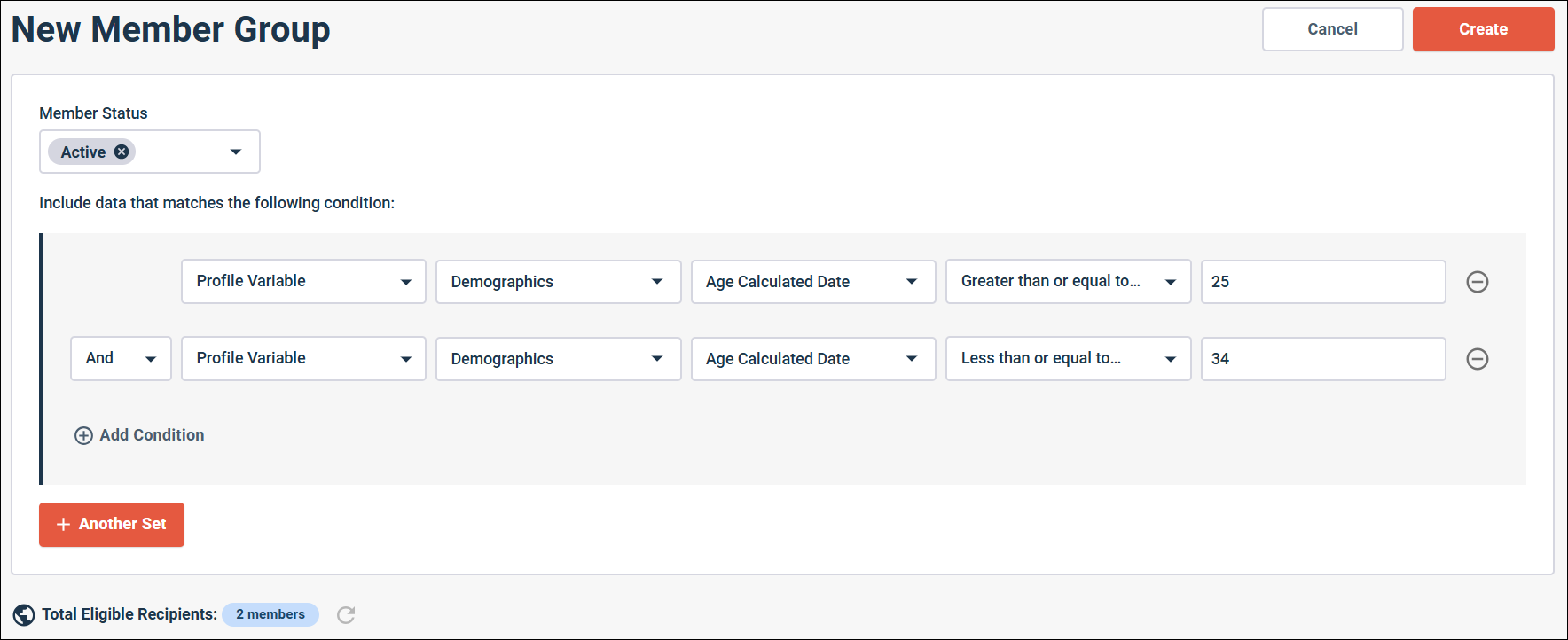 Create a new member group to select members that are between the ages of 25 and 34. Create criteria that select members where there age is greater than or equal to 25 years and less than or equal to 34 years. Whenever the member group is applied, members that meet the criteria at that time are included in the Total Eligible Recipients count. Add additional member groups to capture any other age ranges you want to use in your distributions. ![]() |